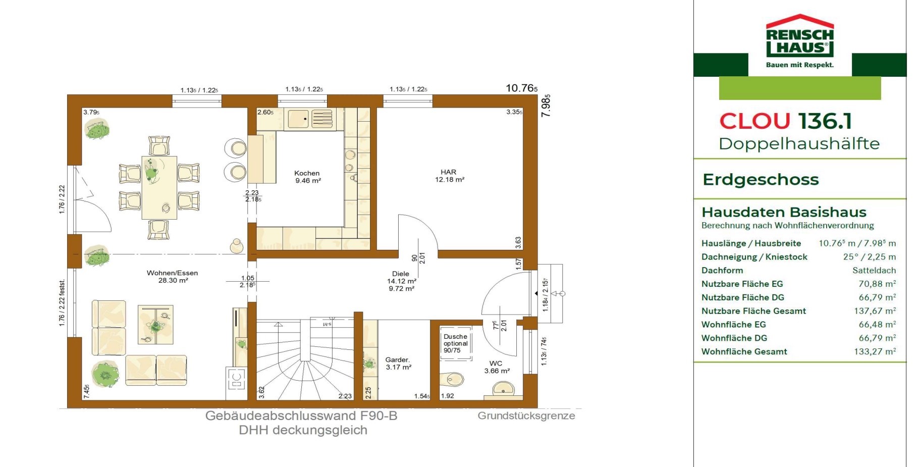 Suchen Sie eine moderne Lösung für die optimale Nutzung von einem kompakten Grundstück? Die Doppelhaushälfte CLOU 136.1 wird Sie begeistern. Schon das Erdgeschoss lässt durch die offene Raumkonzeption ein attraktives und großzügiges Wohnerlebnis erahnen. Der hohe Kniestock ermöglicht im Dachgeschoss viele Möblierungsalternativen. Außerdem bietet das CLOU 136.1 eine beliebte T-Bad-Lösung, eine integrierte Ankleide sowie zwei großzügige Kinderzimmer.
