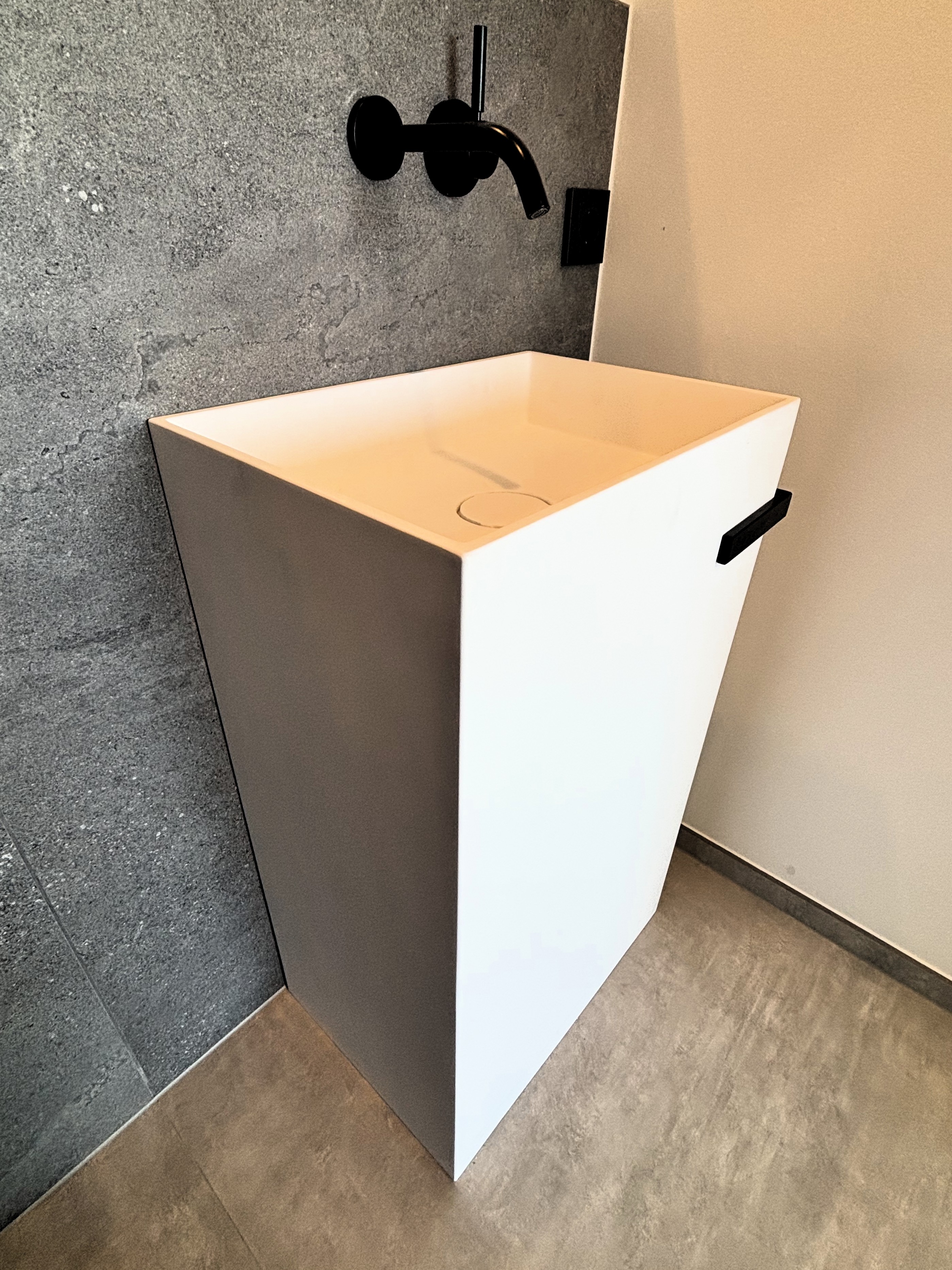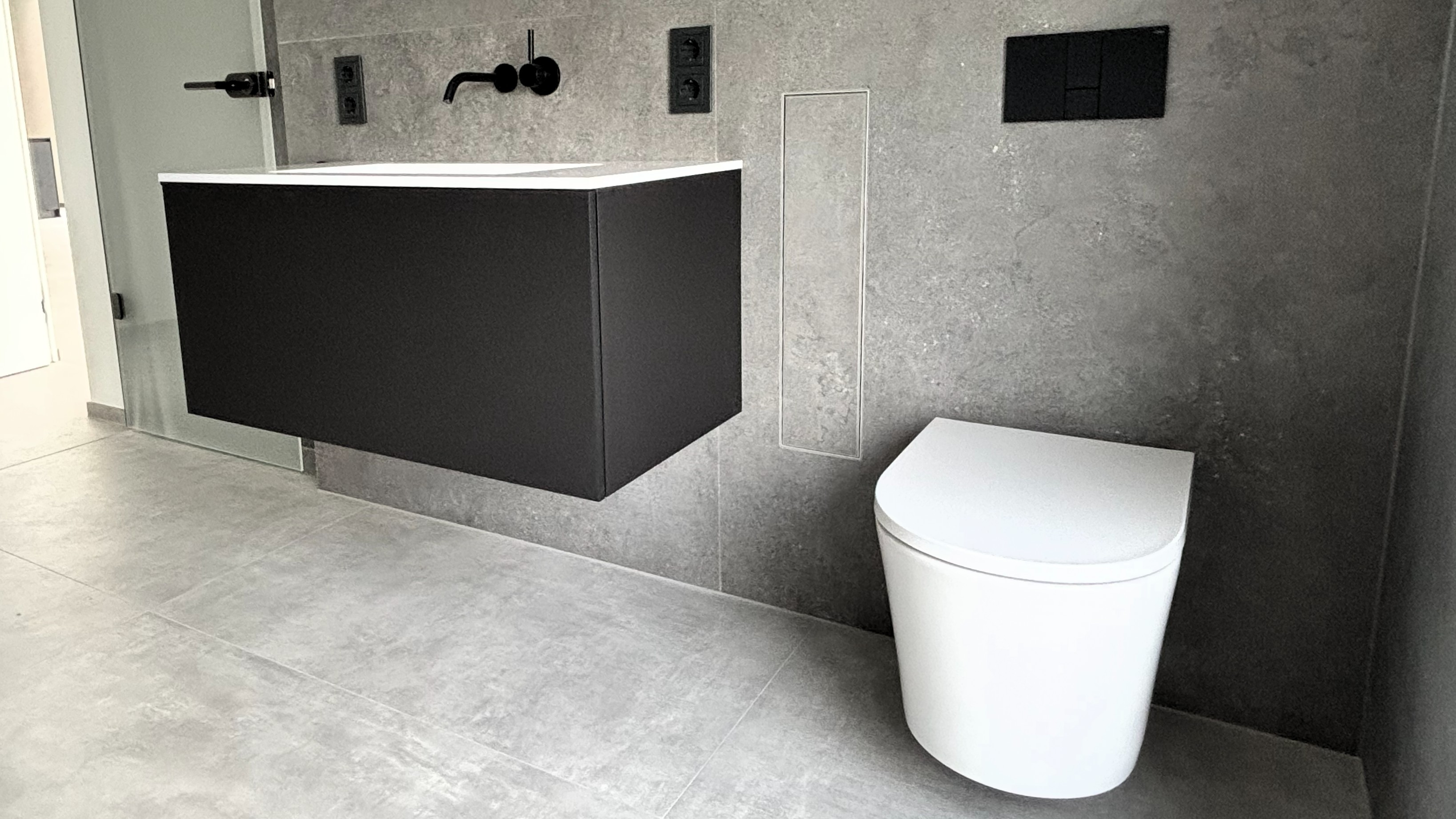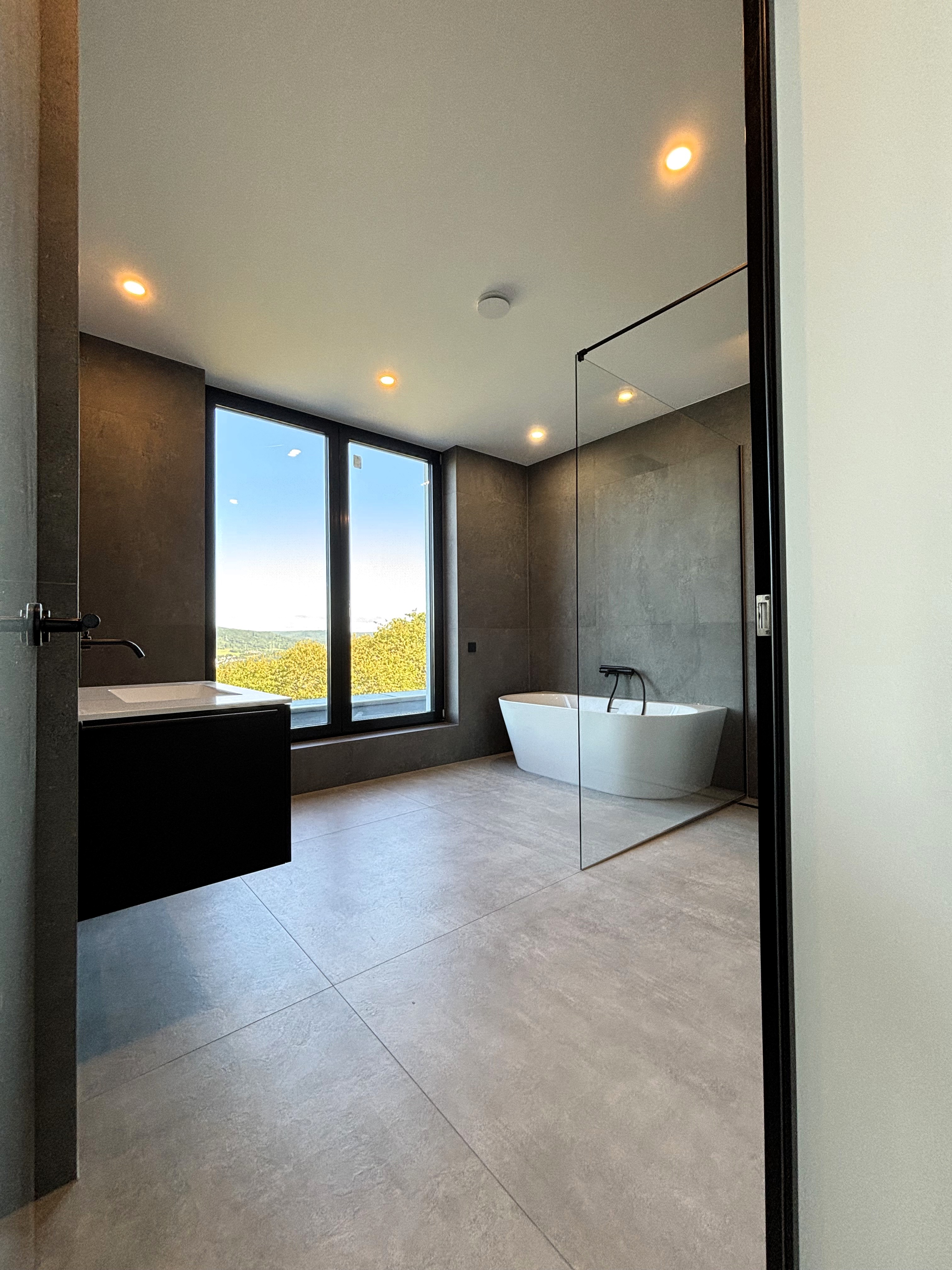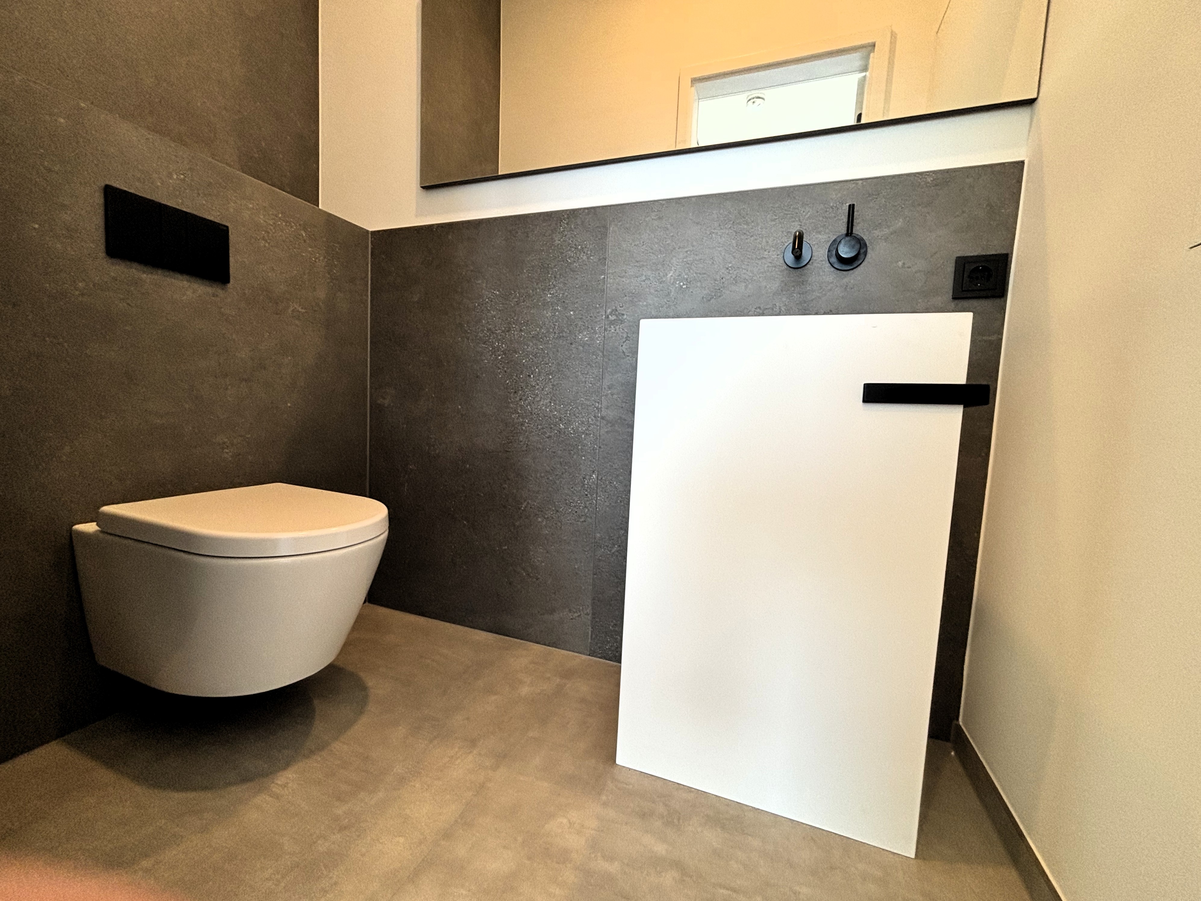Neben dem Badezimmer mit gefliester bodentiefer Dusche und der freistehenden Designerbadewanne, steht den Bewohnern zusätzlich ein Gäste-WC im Eingangsbereich zur Verfügung.