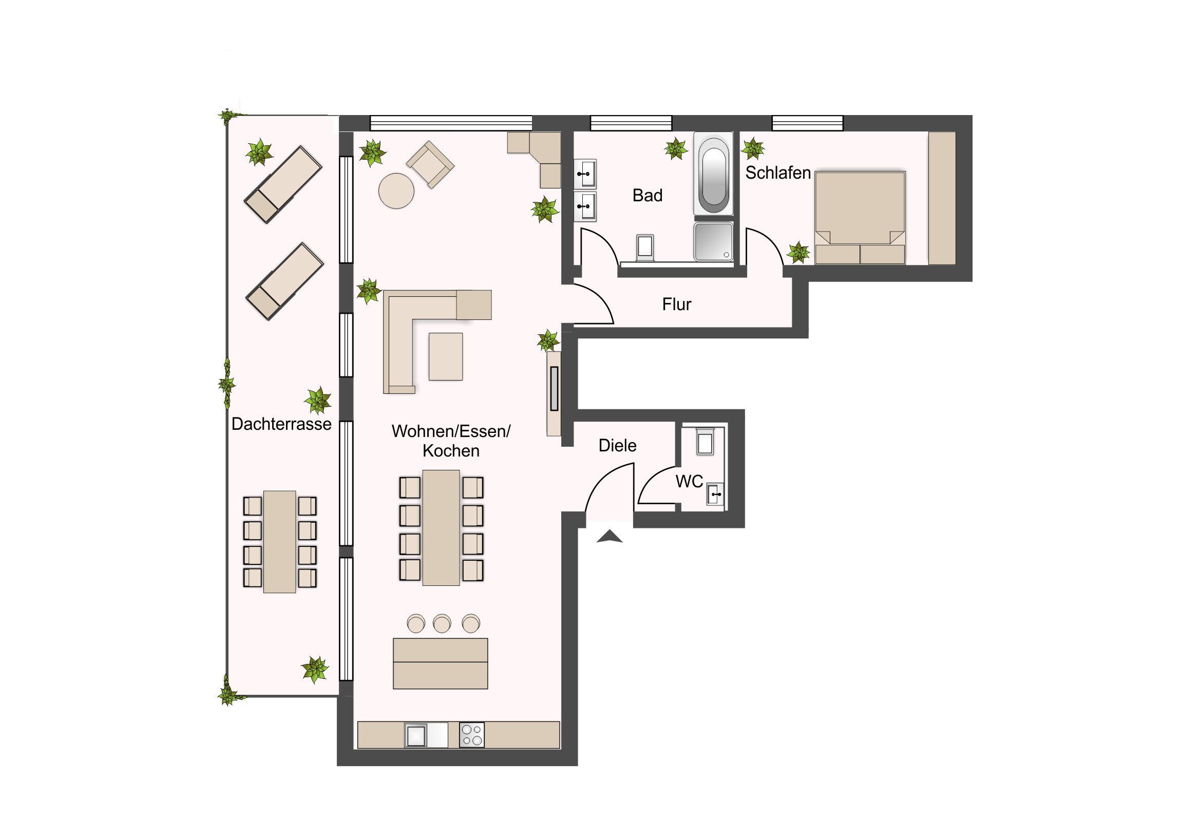 Die große Dachterrasse, welche die komplette Wohnung umgibt, ist sicher ein Highlight dieser Premiumwohnung.