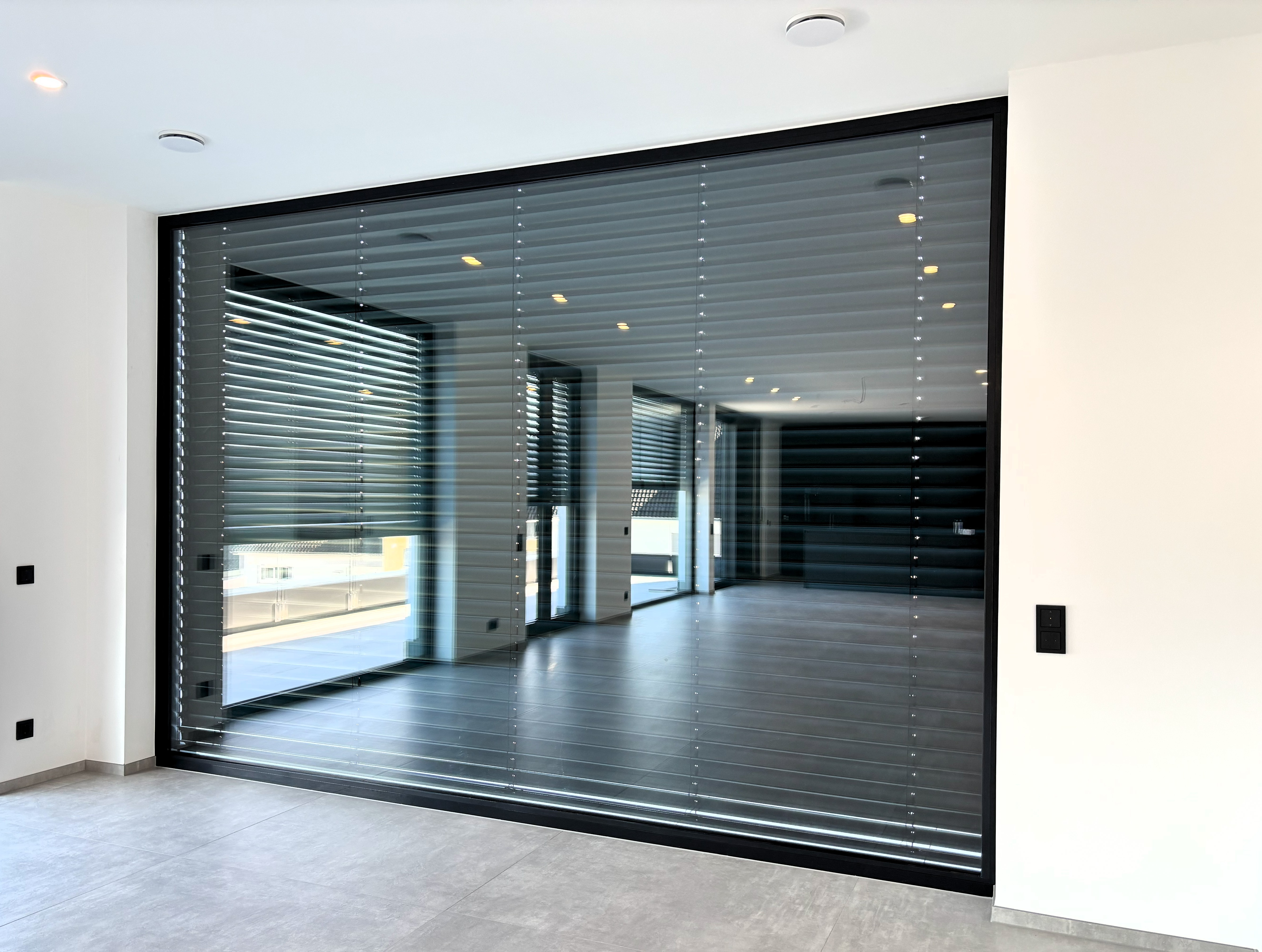 Das Penthouse hat eine durchgehende Deckenhöhe 2,75m und großformatige bodentiefe Panoramafenster, die rundum durch hochwertige Alu-Raffstores abgeschattet werden.